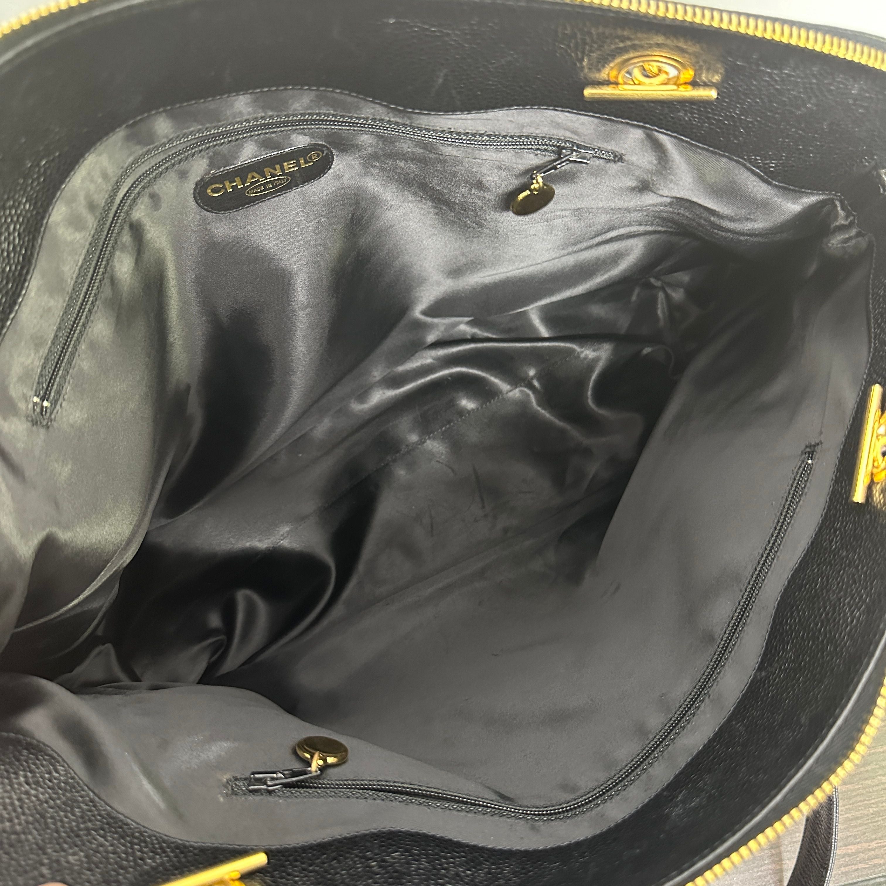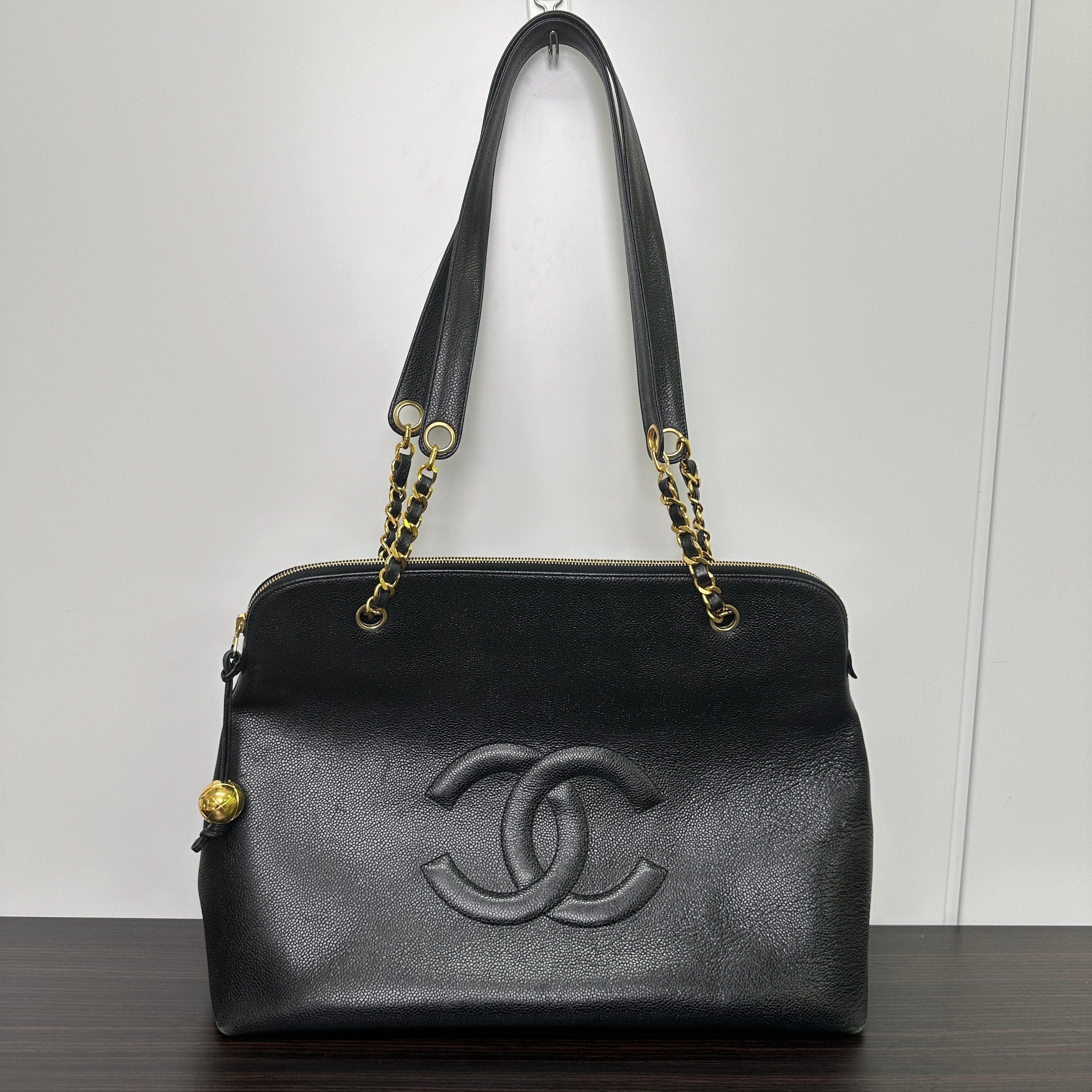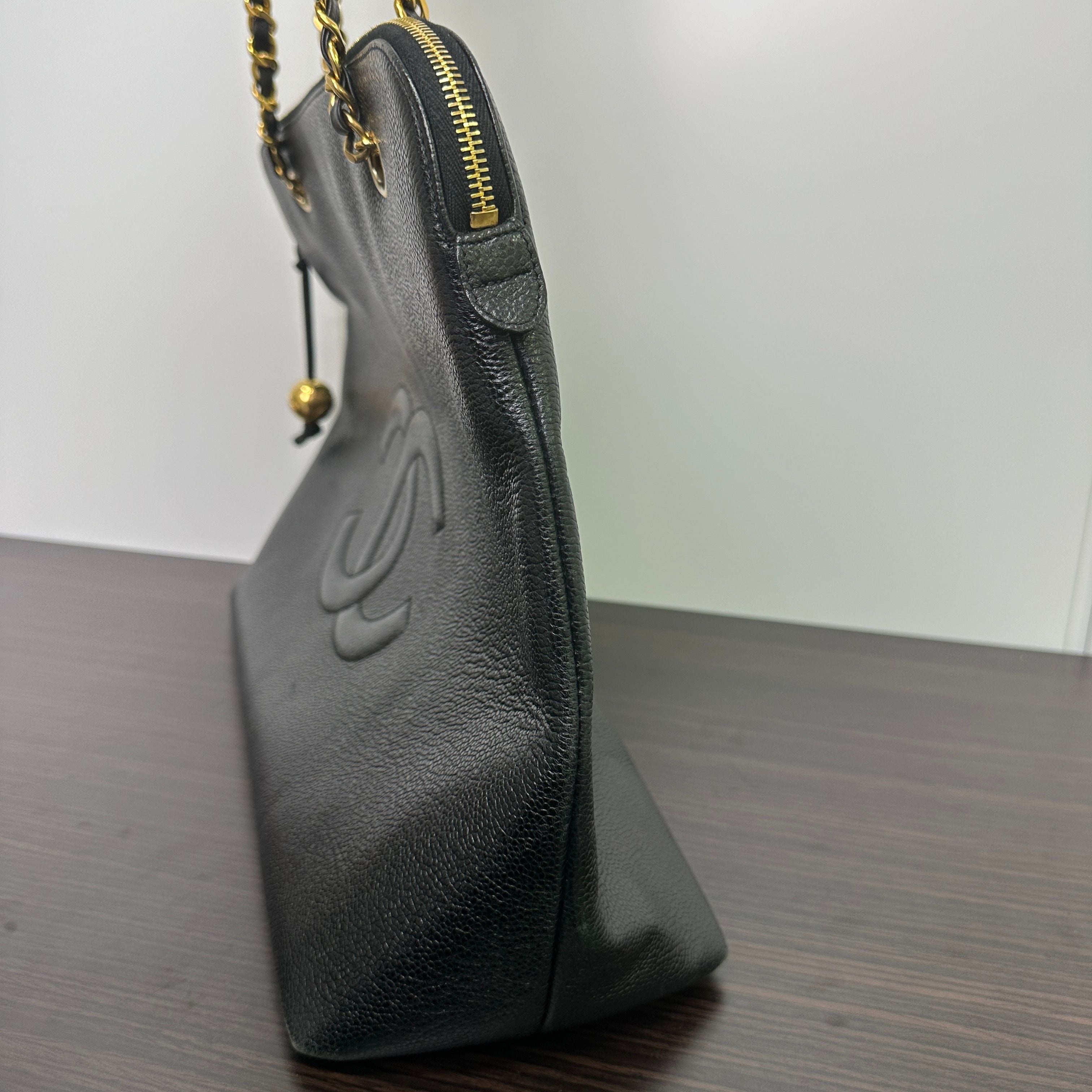CONDITION Fair Good Very Good Great Excellent Pristine Condition Details No significant scratches on the exterior, no noticeable stains on the interior, overall in good condition. Serial Model • No Chip Authentication • Entrupy OVERVIEW Exterior Color Black Exterior Material Caviar leather Lining Color Black Lining Material Leather Handle/Strap Color Black and gold-tone Handle/Strap Material Leather and chain Hardware Color Gold-tone Closure Flap with CC turn-lock Pattern Quilted Size 6 x 10 x 2.5 inches Presenting the CHANEL Pre-Owned 1995 CC Caviar-Leather Shoulder Bag in timeless black, a distinguished piece from the iconic Chanel Classic line. Crafted from durable caviar leather with a quilted pattern, this round shoulder bag measures 6 x 10 x 2.5 inches, featuring a black leather and gold-tone chain strap and a flap closure with the signature CC turn-lock. The interior is lined with smooth black leather, complementing the elegant gold-tone hardware. This pre-owned bag is in great condition (8.5/10), with no significant exterior scratches or interior stains, authenticated by Entrupy, making it a refined addition to any collection.