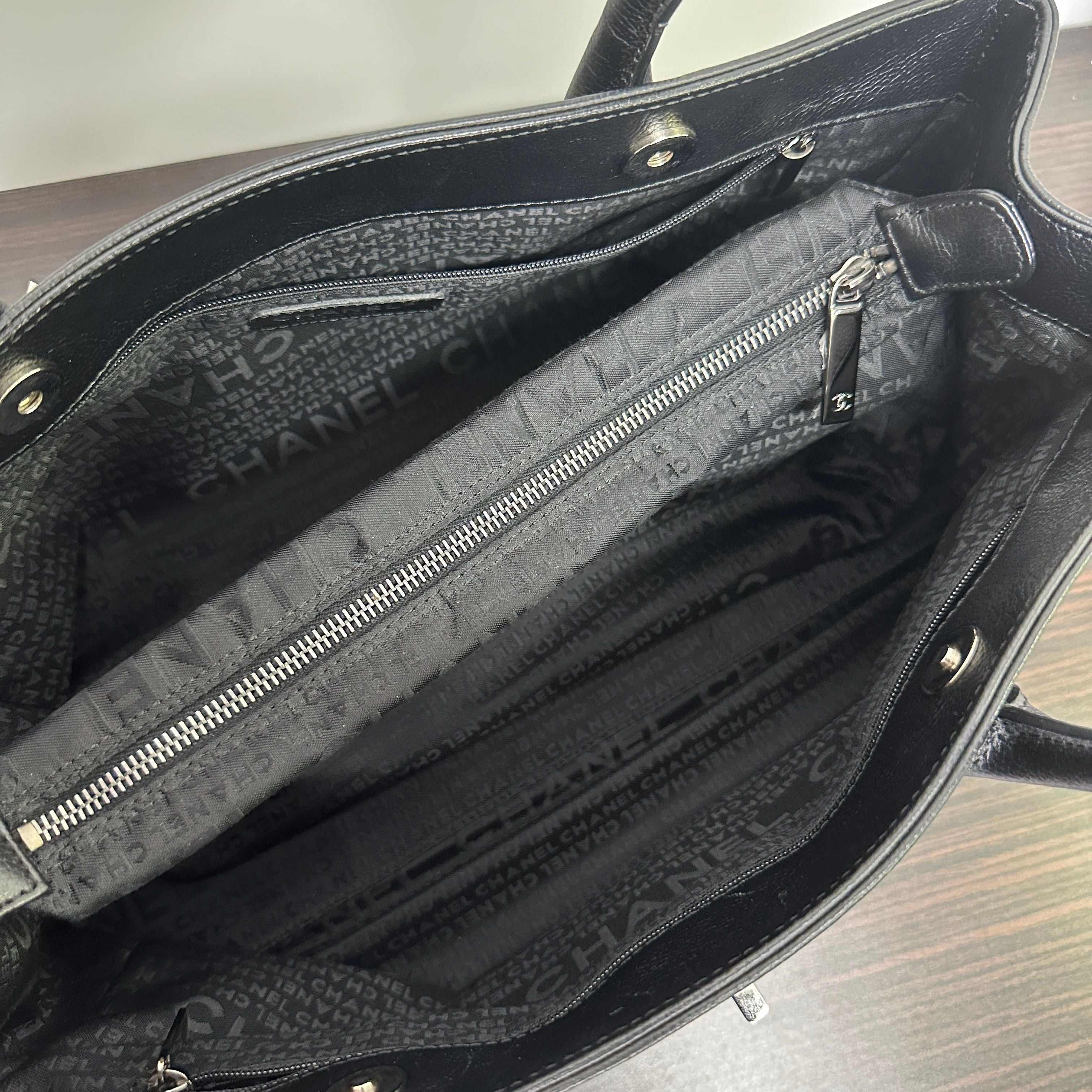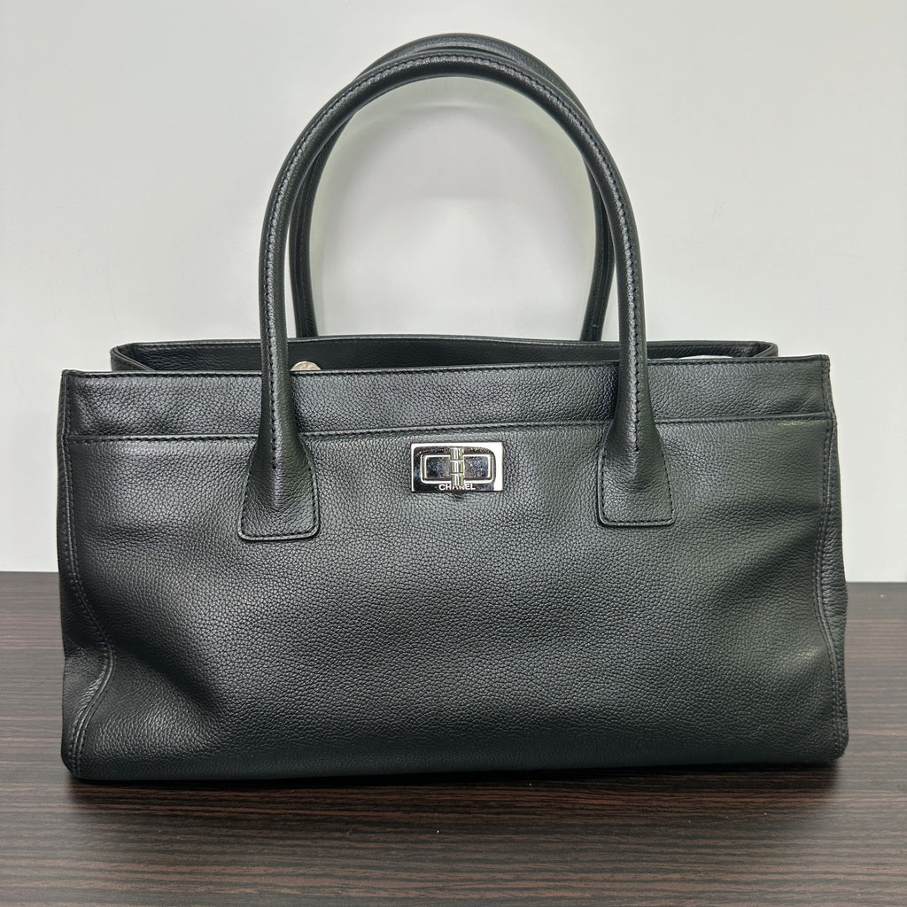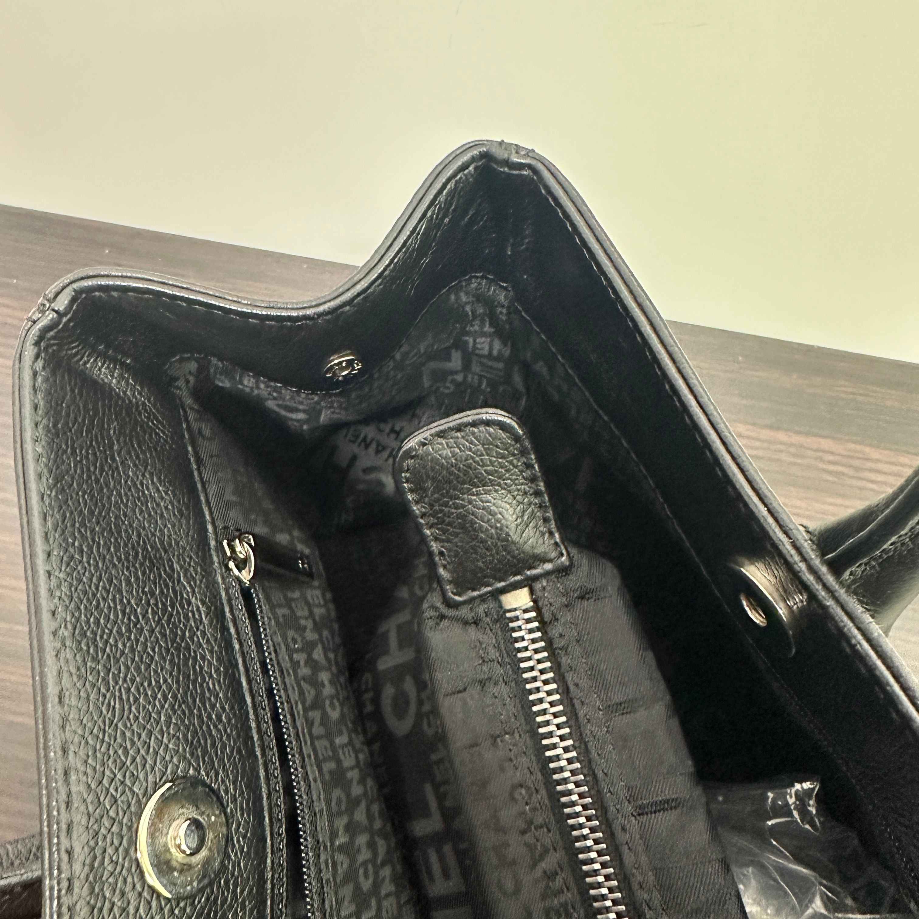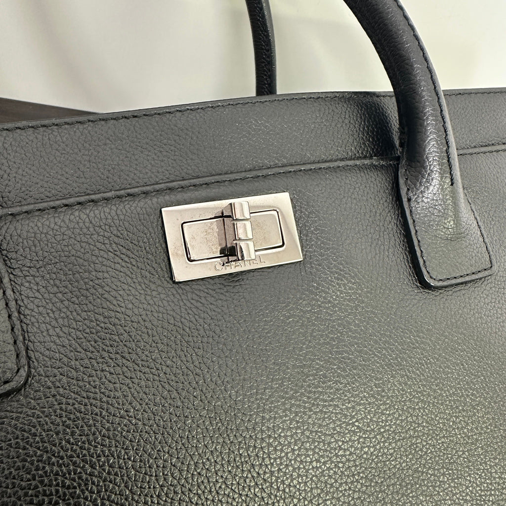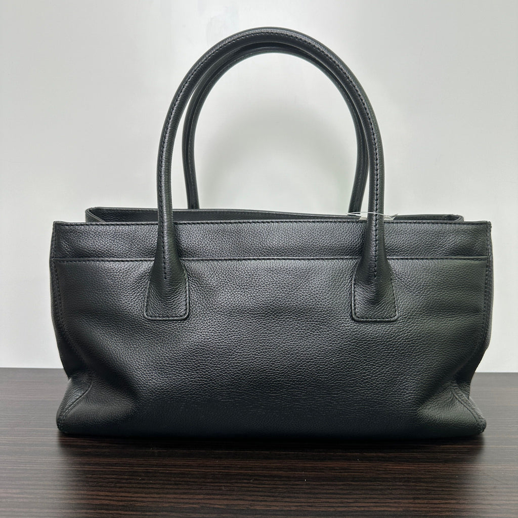 CONDITION Fair Good Very Good Great Excellent Pristine Condition Details No significant scratches on the exterior, no noticeable stains on the interior, overall in good condition. Serial Model • No Chip Authentication • Entrupy OVERVIEW Exterior Color Black Exterior Material Grained calfskin leather Lining Color Not specified Lining Material Not specified Handle/Strap Color Black Handle/Strap Material Leather Hardware Color - Closure Turn lock Pattern Solid Size 7.68 x 13.39 x 4.33 (inches) Introducing the CHANEL Tote Bag Executive Line 2.55, a sophisticated accessory crafted from luxurious black grained calfskin leather. This elegant tote pouch, designed for women, measures 7.68 x 13.39 x 4.33 inches and features a secure turn lock closure with matching black leather handles. As a pre-owned item, it is authenticated by Entrupy and rated 8.5/10 in condition, exhibiting no significant exterior scratches or interior stains, ensuring excellent quality. The timeless solid pattern and refined craftsmanship make it an ideal choice for those seeking both style and functionality in a classic Chanel piece.