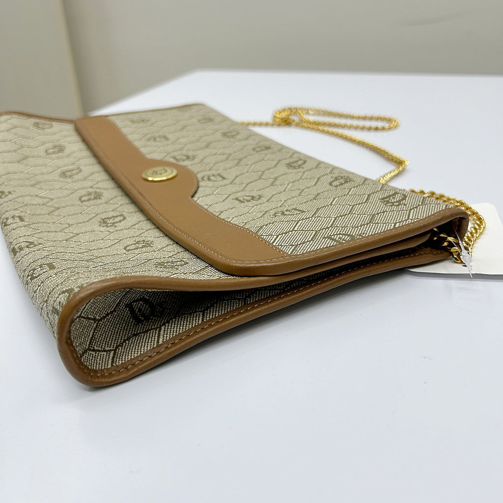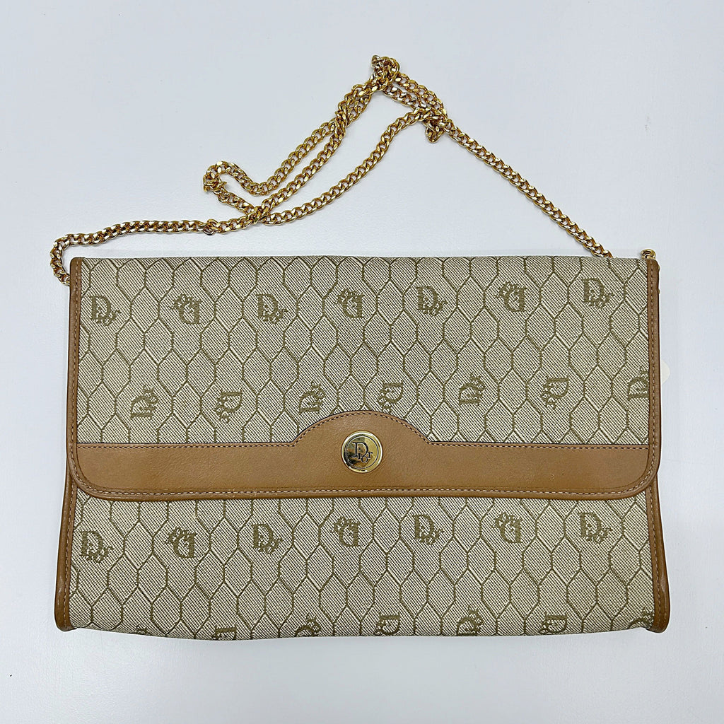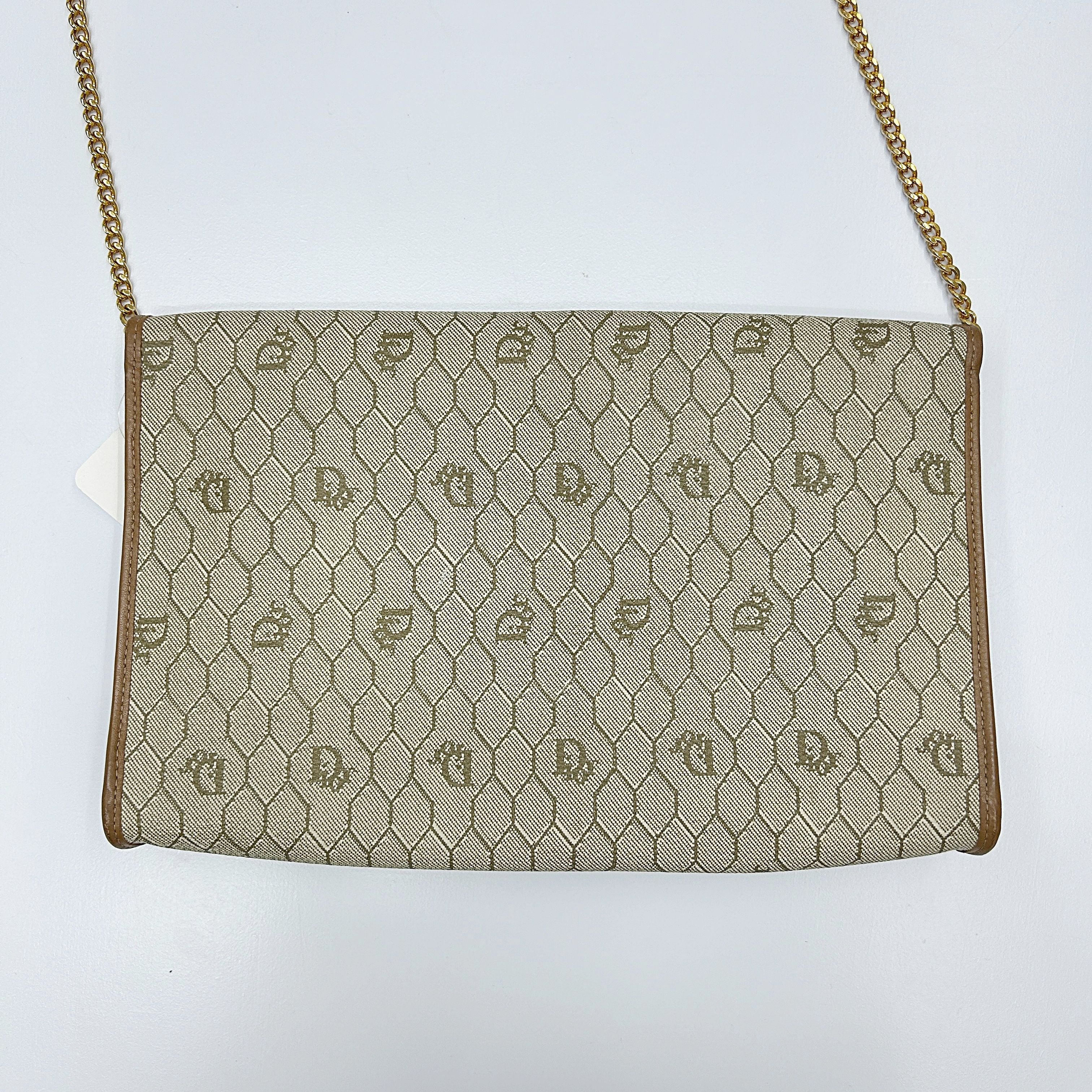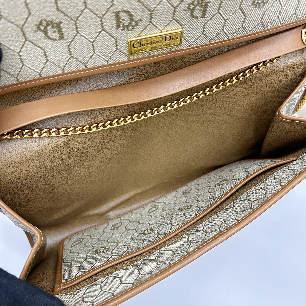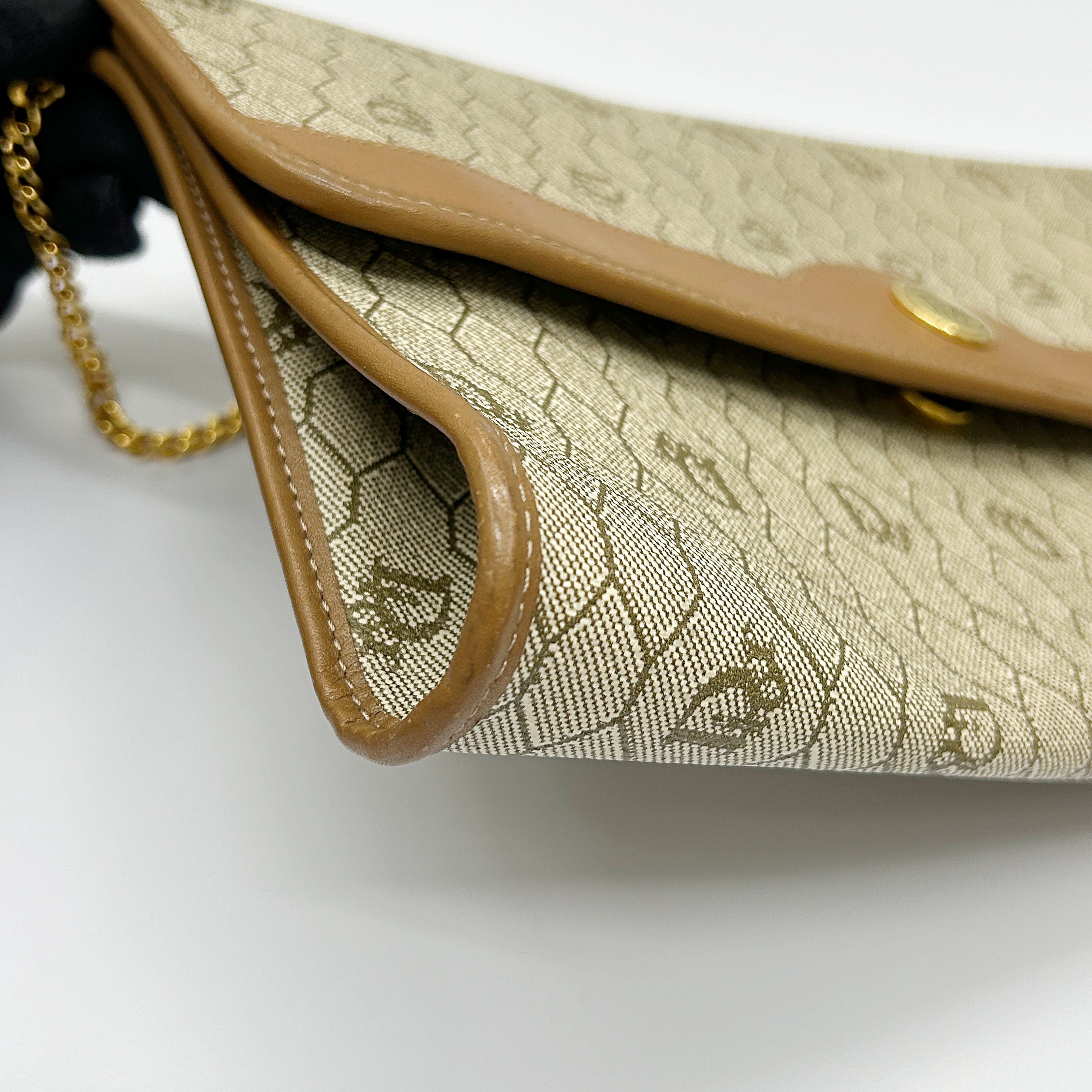 CONDITION Fair Good Very Good Great Excellent Pristine Condition Details Slightly soiled on the outside, with stains and scratches on the edges. Serial Model • No Chip Authentication • Entrupy OVERVIEW Exterior Color Beige Exterior Material PVC leather Lining Color Beige Lining Material Leather Handle/Strap Color Gold Handle/Strap Material Chain Hardware Color Gold Closure Magnetic snap Pattern Monogram Size 7 x 10 x 3 inches Introducing the Christian Dior PVC Leather Shoulder Bag in a sophisticated beige tone, perfect for women seeking timeless elegance. This medium-sized round shoulder bag measures 7 x 10 x 3 inches and features the iconic Dior monogram pattern. Crafted from durable PVC leather with a luxurious beige leather lining, it is complemented by a gold chain strap and gold hardware, secured by a magnetic snap closure. This pre-owned piece is authenticated by Entrupy and rated 8.5/10 in condition, showing slight soiling and minor stains with edge scratches, reflecting its gentle use. A refined accessory for any wardrobe.