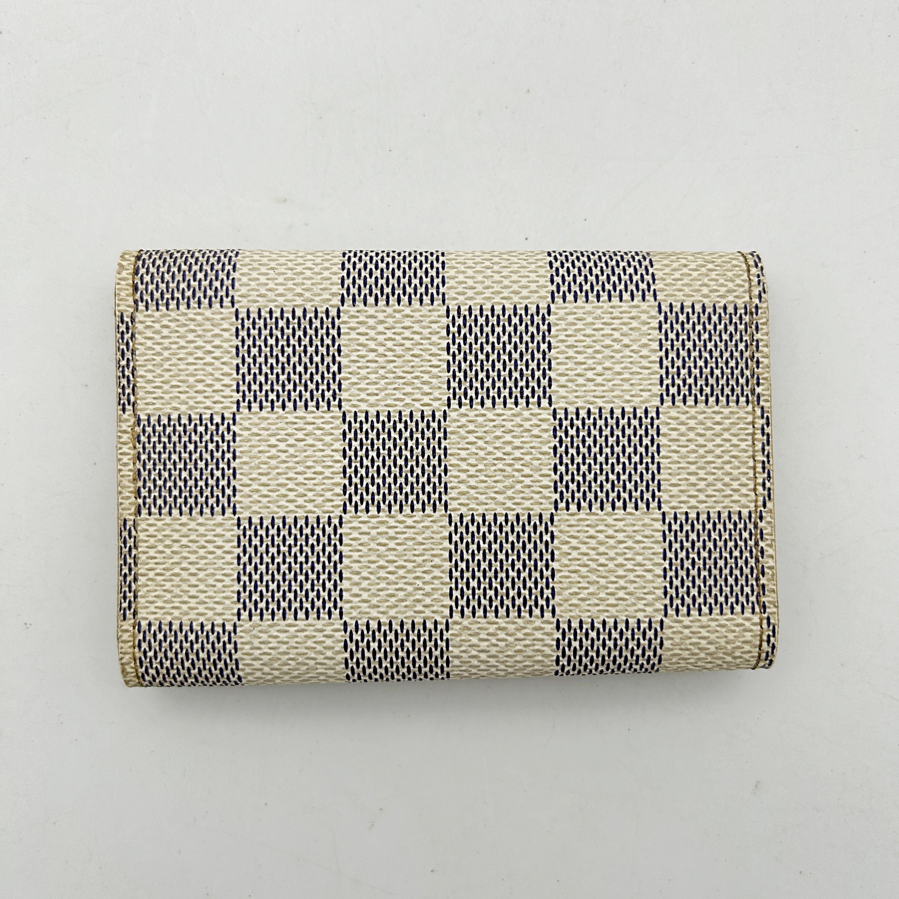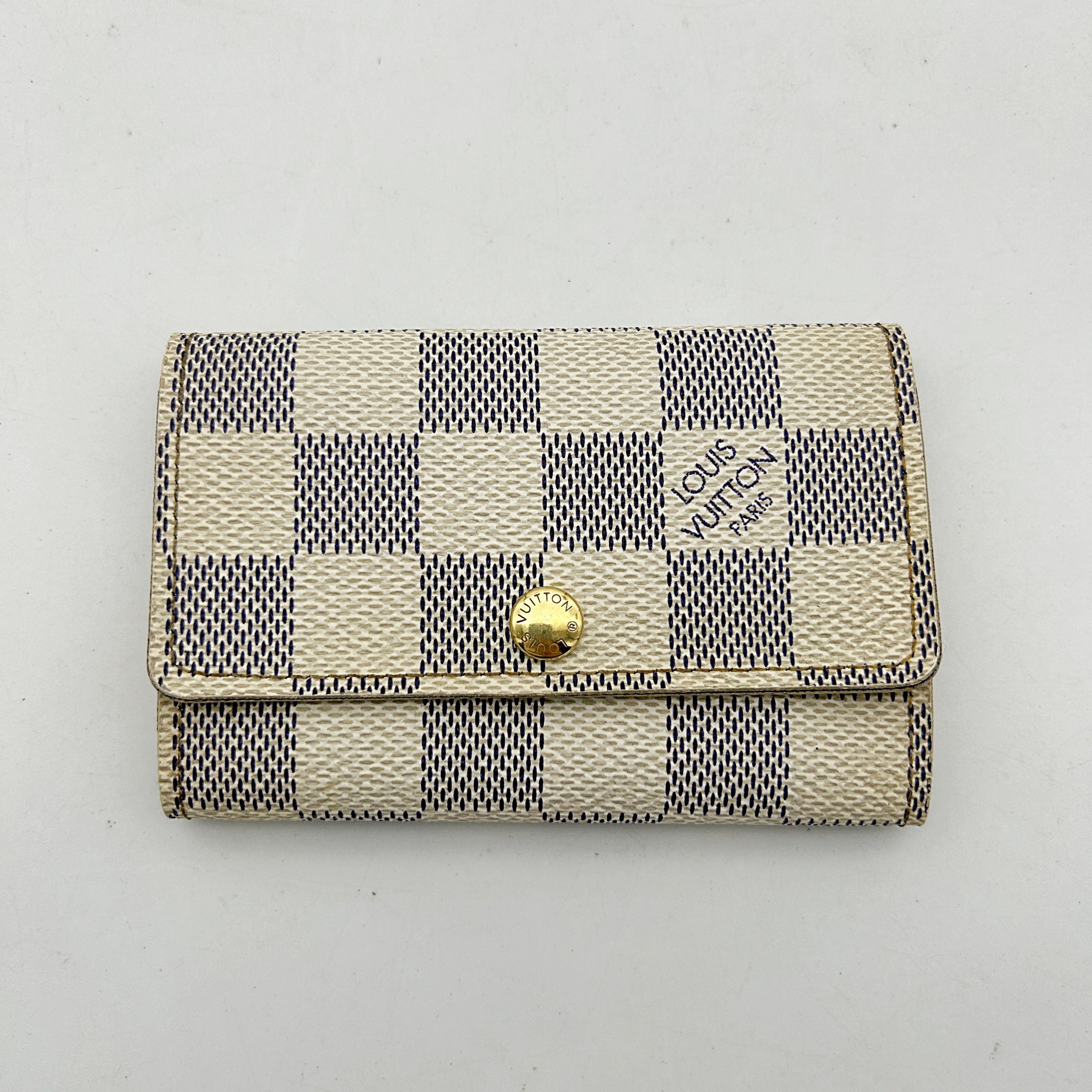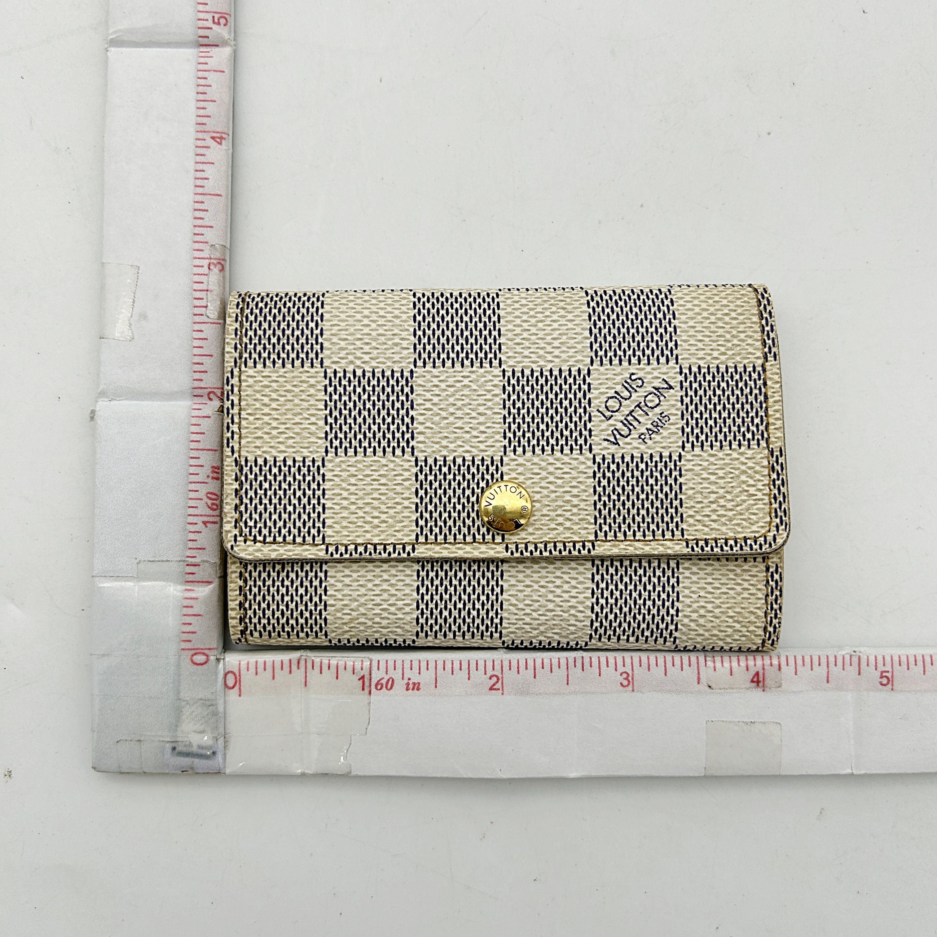 CONDITION Fair Good Very Good Great Excellent Pristine Condition Details Slightly scuffed along the edges, with minor soiling on both the inside and outside. Serial Model • No Chip Authentication • Entrupy OVERVIEW Exterior Color White Checkered Exterior Material Canvas Lining Color Beige Lining Material Leather Handle/Strap Color N/A Handle/Strap Material N/A Hardware Color Gold Closure Snap Pattern Damier Azur Size 2.8 x 4.1 x 0.8 inches Discover the elegance and functionality of the Louis Vuitton Damier Azur White Checkered 6 Key Hook Holder Pouch Wallet. Crafted from premium canvas with a chic white checkered pattern, this accessory is lined with luxurious beige leather, offering both style and durability. Despite being pre-owned, it is in very good condition with an 8/10 rating, showing only slight scuffing along the edges and minimal soiling. The gold hardware adds a touch of sophistication, making it a perfect addition to your accessories collection. Authenticated by Entrupy, this key holder is a testament to timeless luxury.