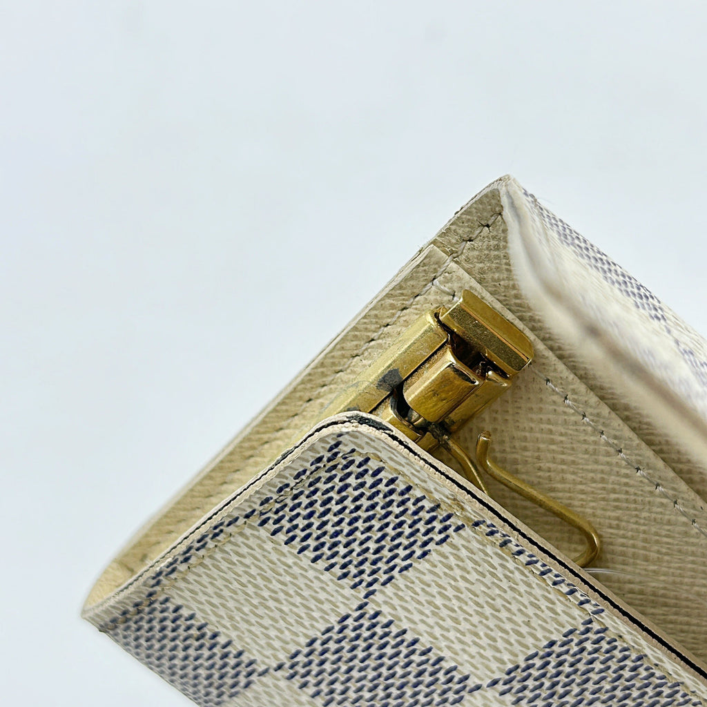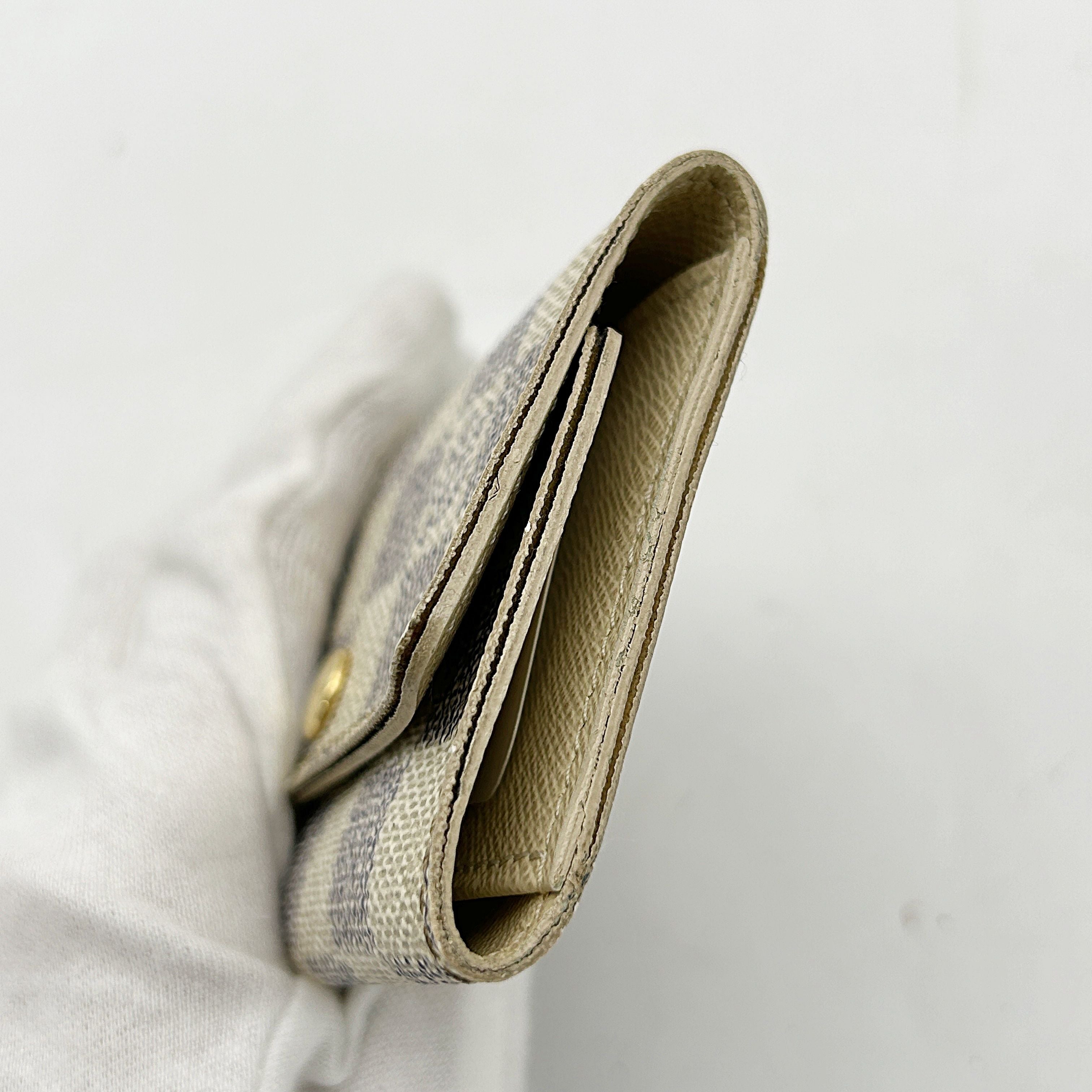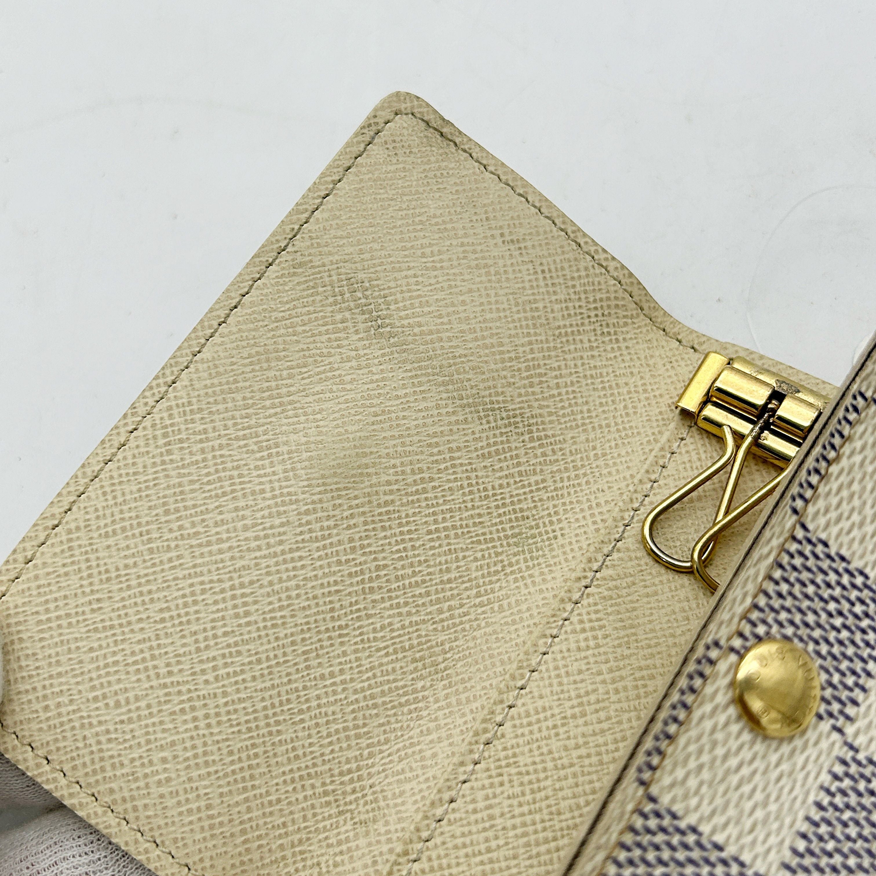 CONDITION Fair Good Very Good Great Excellent Pristine Condition Details Slightly scuffed along the edges, with minor soiling on both the inside and outside. Serial Model • No Chip Authentication • Entrupy OVERVIEW Exterior Color White Checkered Exterior Material Canvas Lining Color Beige Lining Material Leather Handle/Strap Color N/A Handle/Strap Material N/A Hardware Color Gold Closure Snap Pattern Damier Azur Size 2.8 x 4.1 x 0.8 inches Discover the elegance and functionality of the Louis Vuitton Damier Azur White Checkered 6 Key Hook Holder Pouch Wallet. Crafted from premium canvas with a chic white checkered pattern, this accessory is lined with luxurious beige leather, offering both style and durability. Despite being pre-owned, it is in very good condition with an 8/10 rating, showing only slight scuffing along the edges and minimal soiling. The gold hardware adds a touch of sophistication, making it a perfect addition to your accessories collection. Authenticated by Entrupy, this key holder is a testament to timeless luxury.