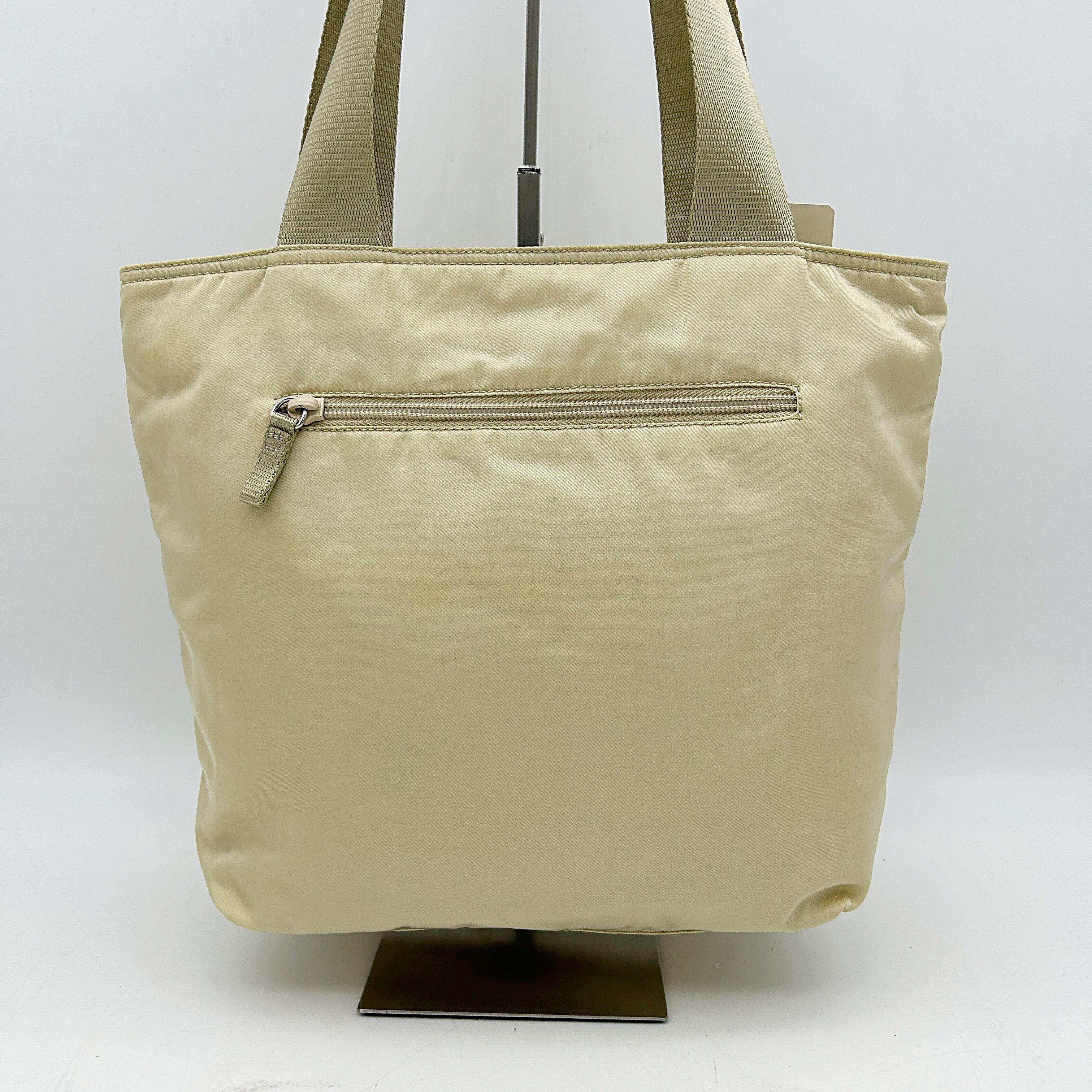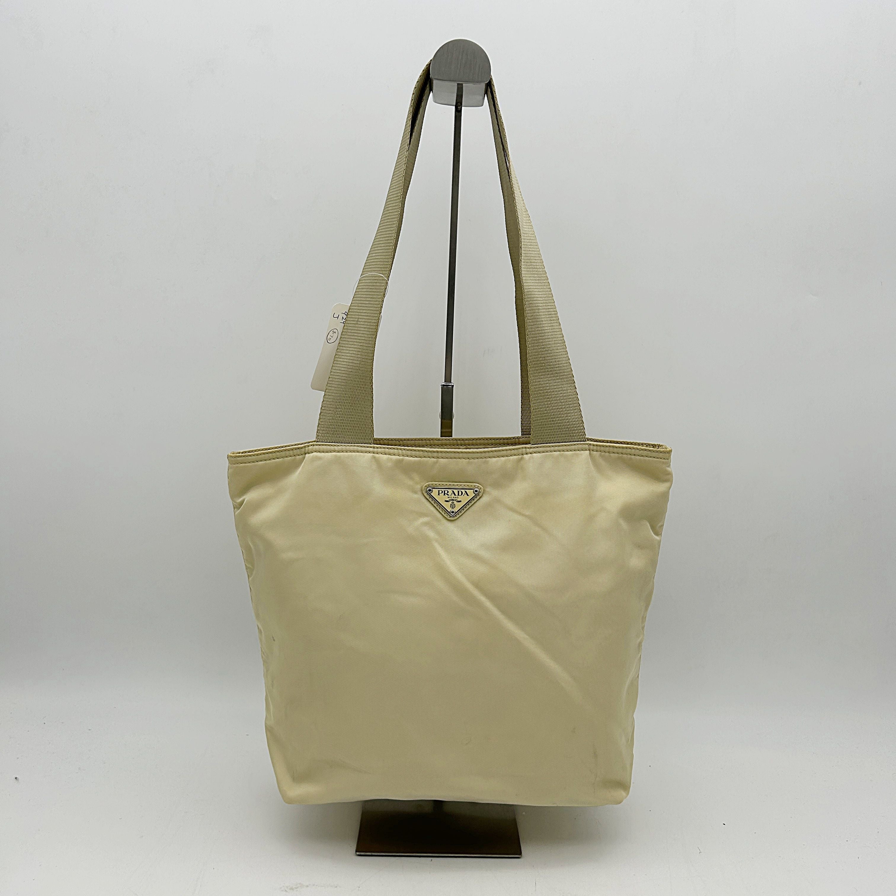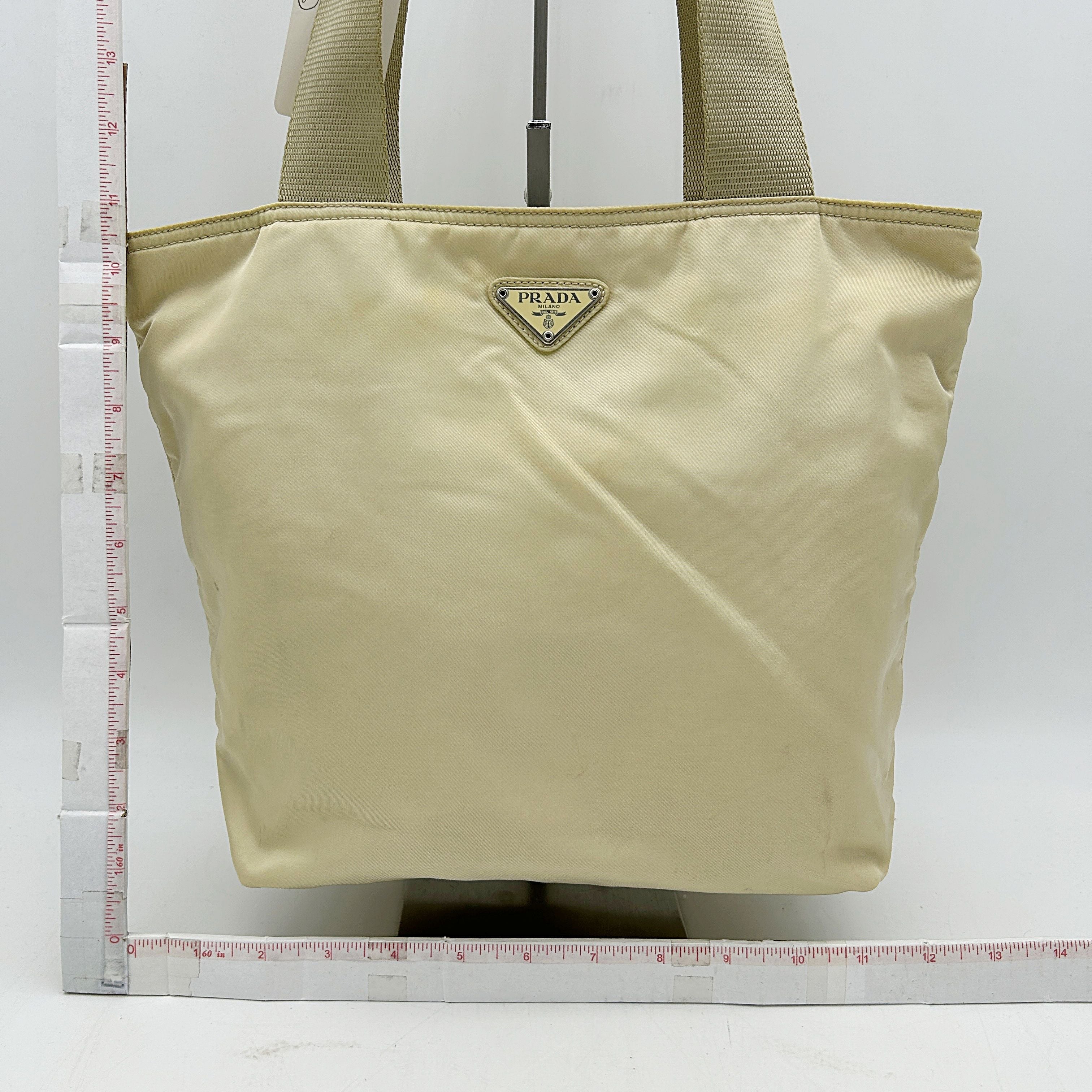 CONDITION Fair Good Very Good Great Excellent Pristine Condition Details There is dirt on the outside, but no noticeable dirt on the inside. Serial Model • No Chip Authentication • Entrupy OVERVIEW Exterior Color Khaki Exterior Material Nylon Lining Color Khaki Lining Material Fabric Handle/Strap Color Khaki Handle/Strap Material Nylon Hardware Color None Closure Zipper Pattern Solid Size 12 x 14 x 6 inches Introducing the PRADA Tote Bag in Khaki, a sophisticated addition to any wardrobe. Crafted from durable nylon, this pre-owned tote boasts a timeless design, perfect for the modern woman. Measuring 12 x 14 x 6 inches, it provides ample space for your essentials. While the exterior shows some signs of wear, the interior remains pristine, reflecting its excellent condition rating of 8.5/10. This authentic Prada piece, verified by Entrupy, features a solid pattern and a secure zipper closure. Elevate your style with this elegant and versatile tote, embodying the luxury and craftsmanship of the Prada brand.