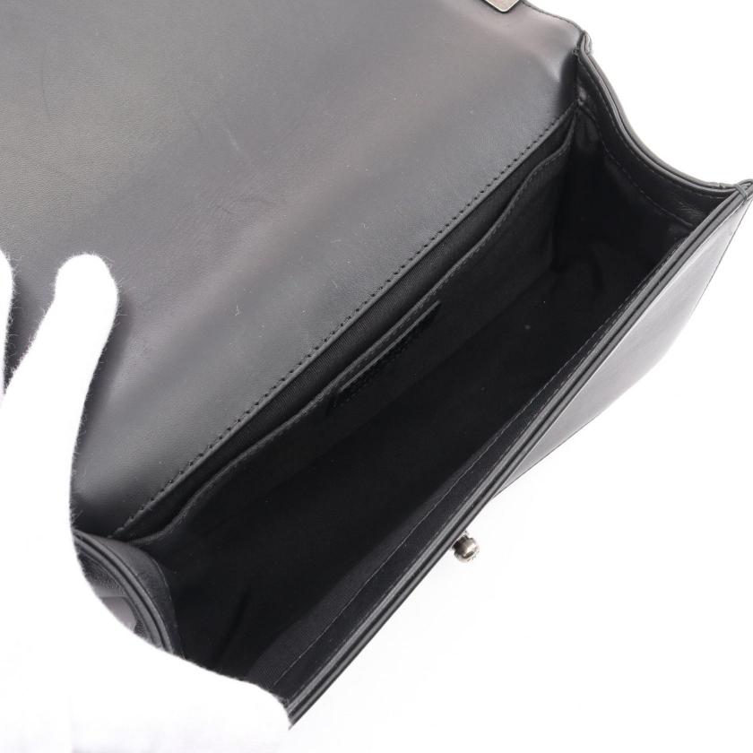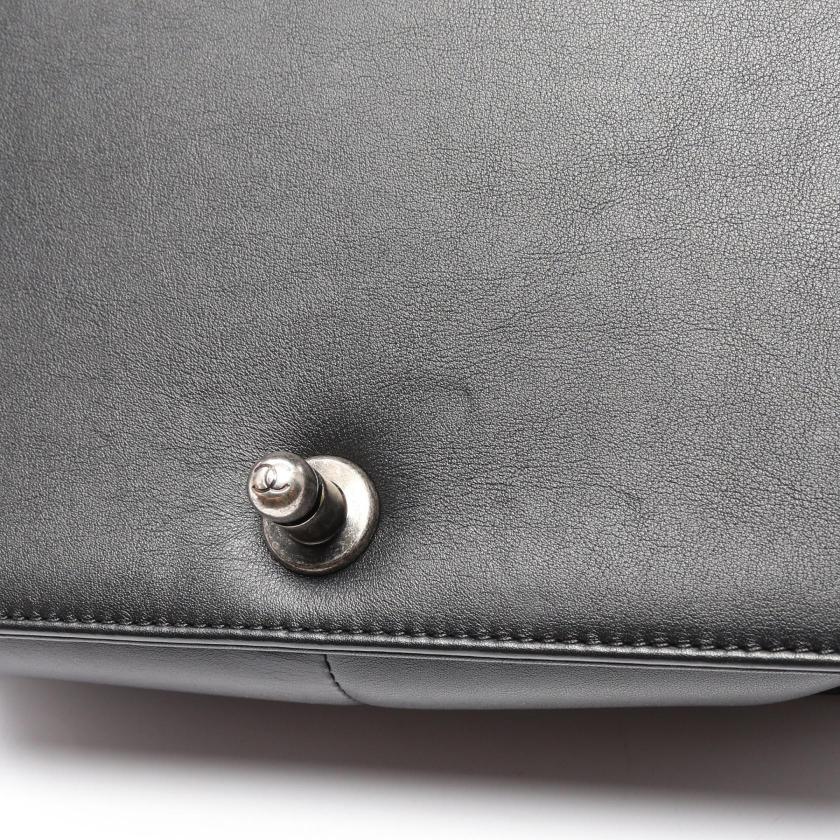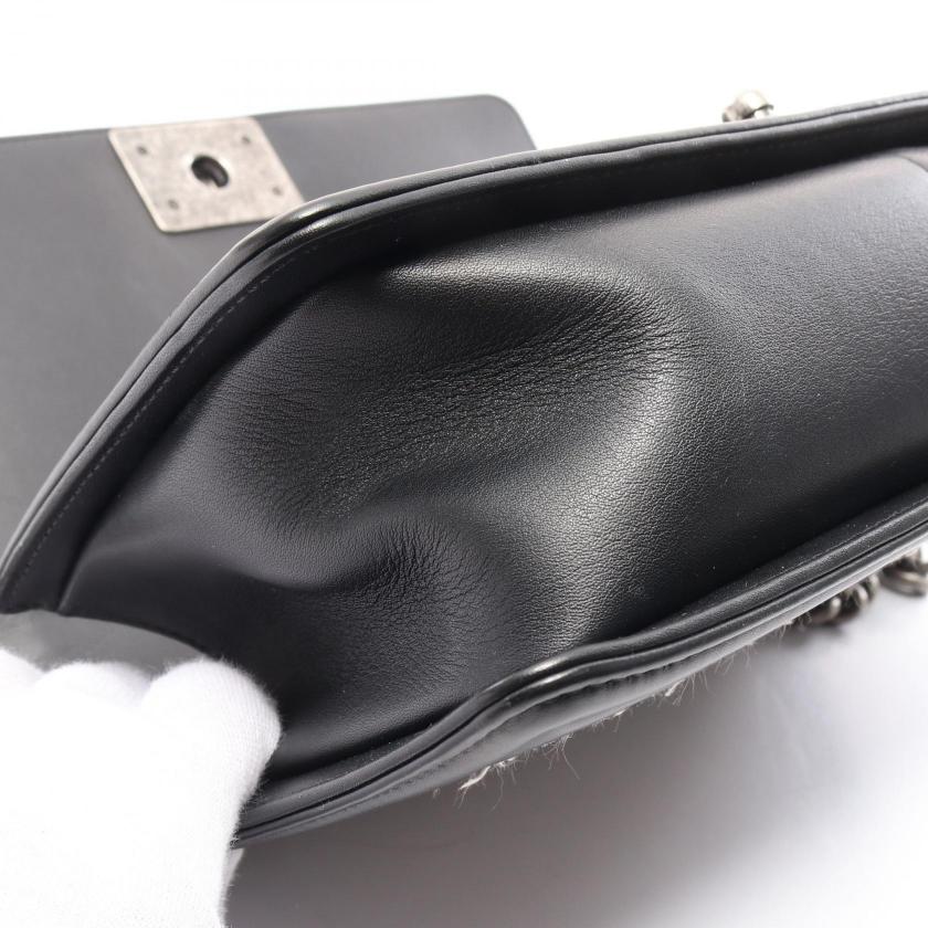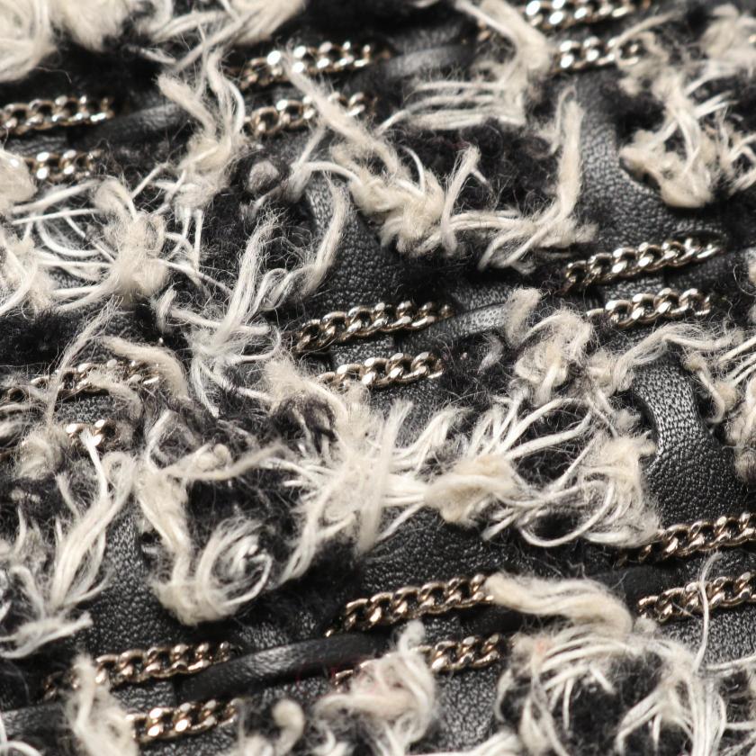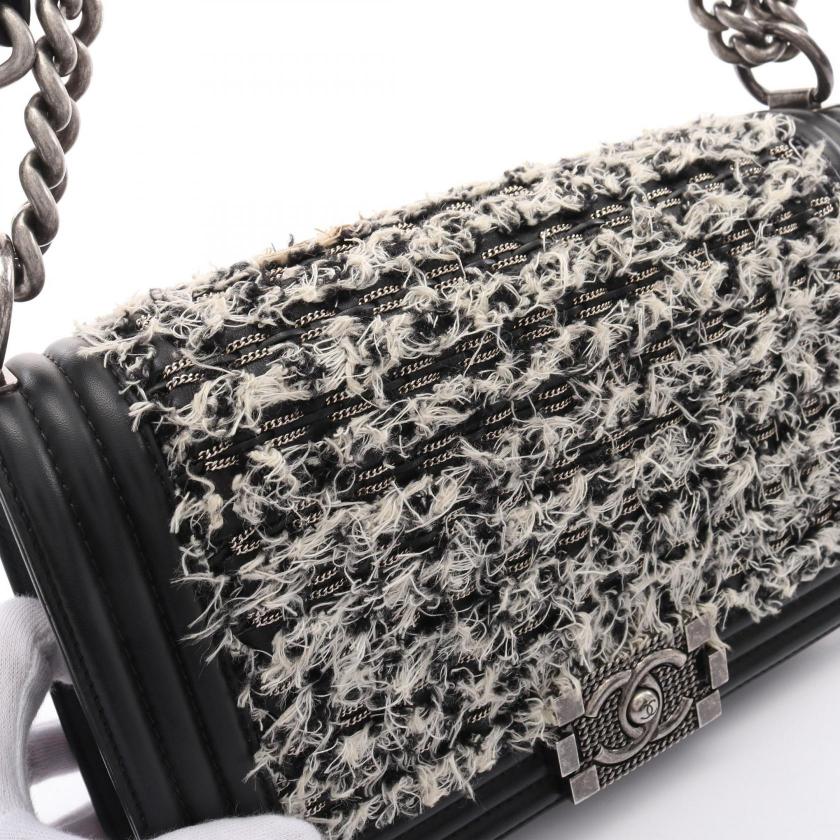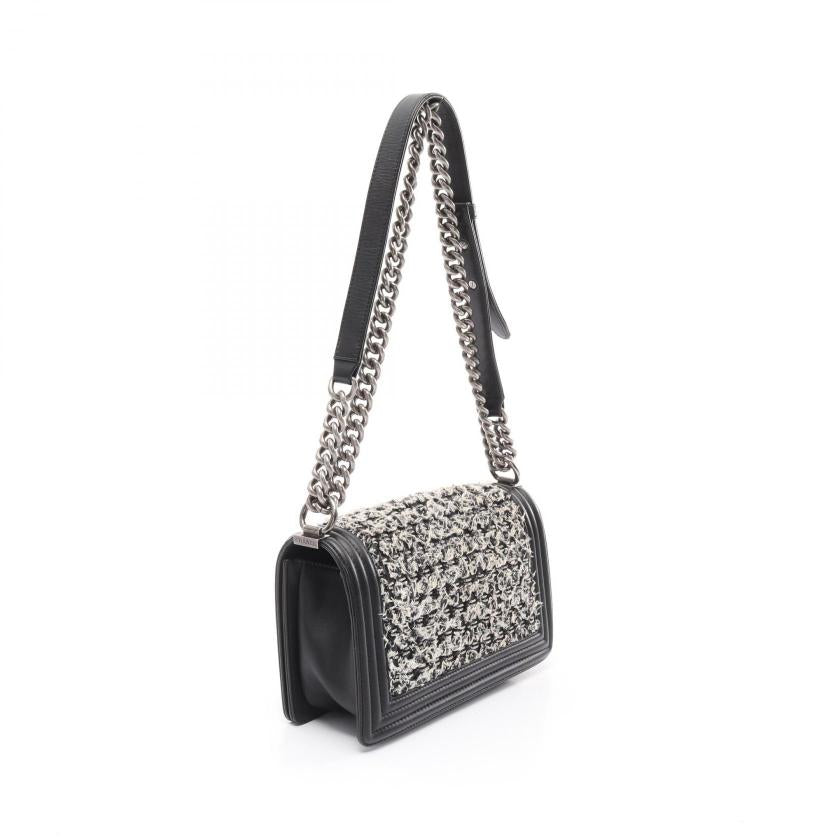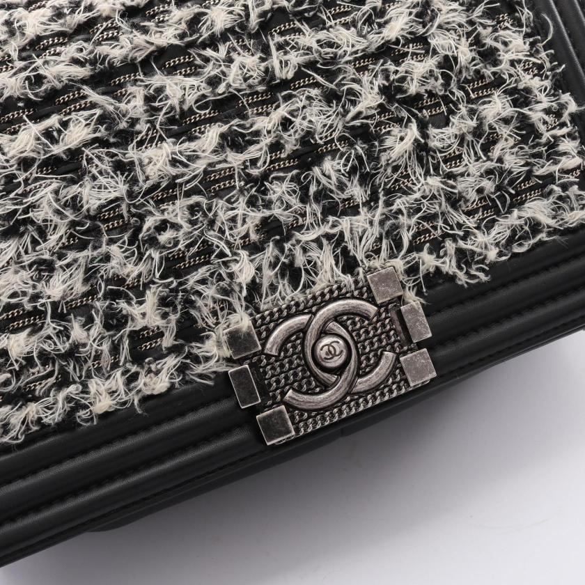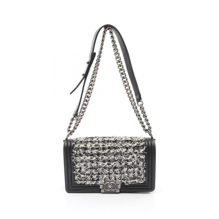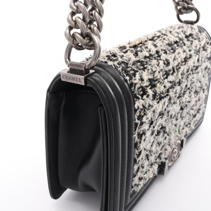 Pre-loved CHANEL boy chanel chain shoulder bag leather tweed black white antique silver hardware 2101218745139