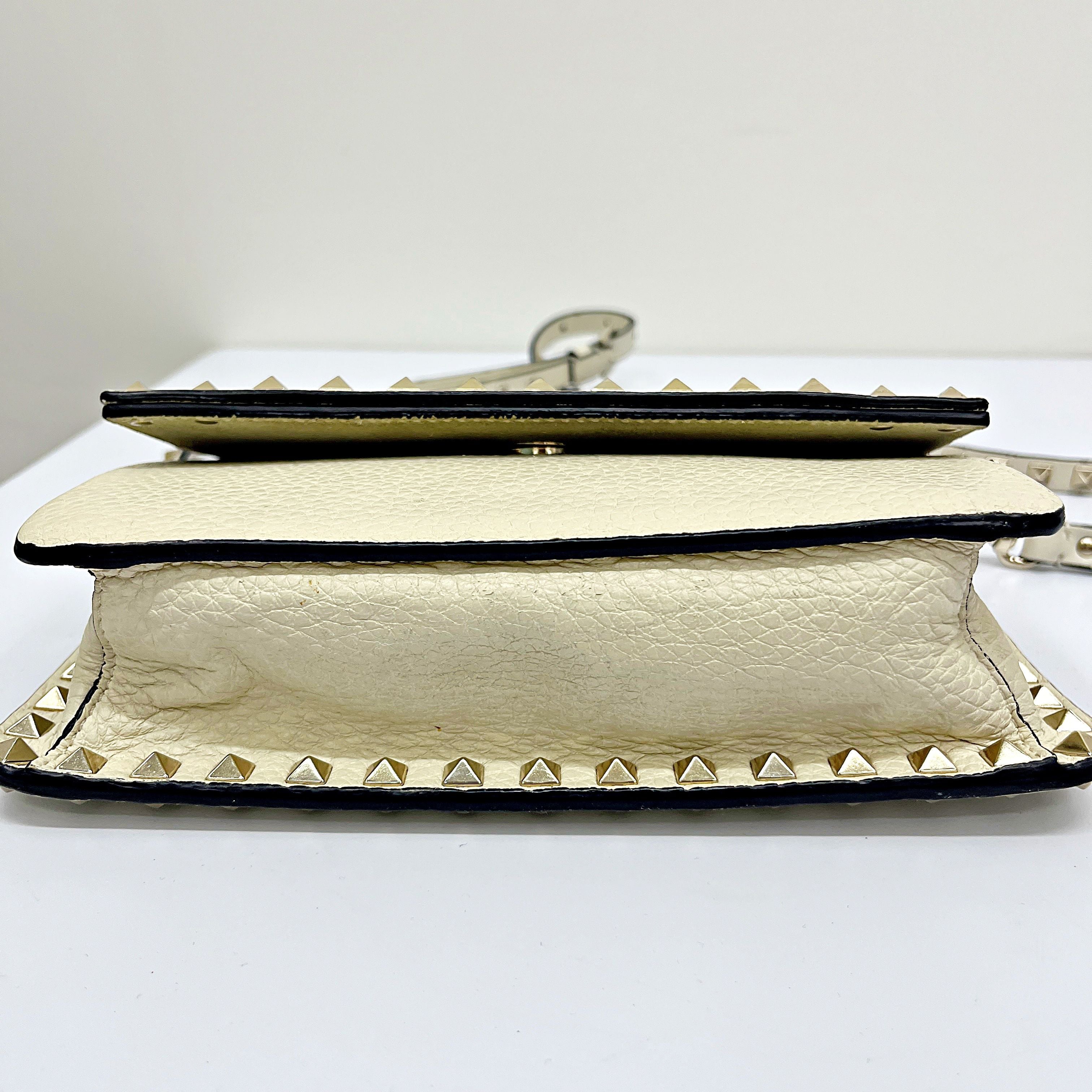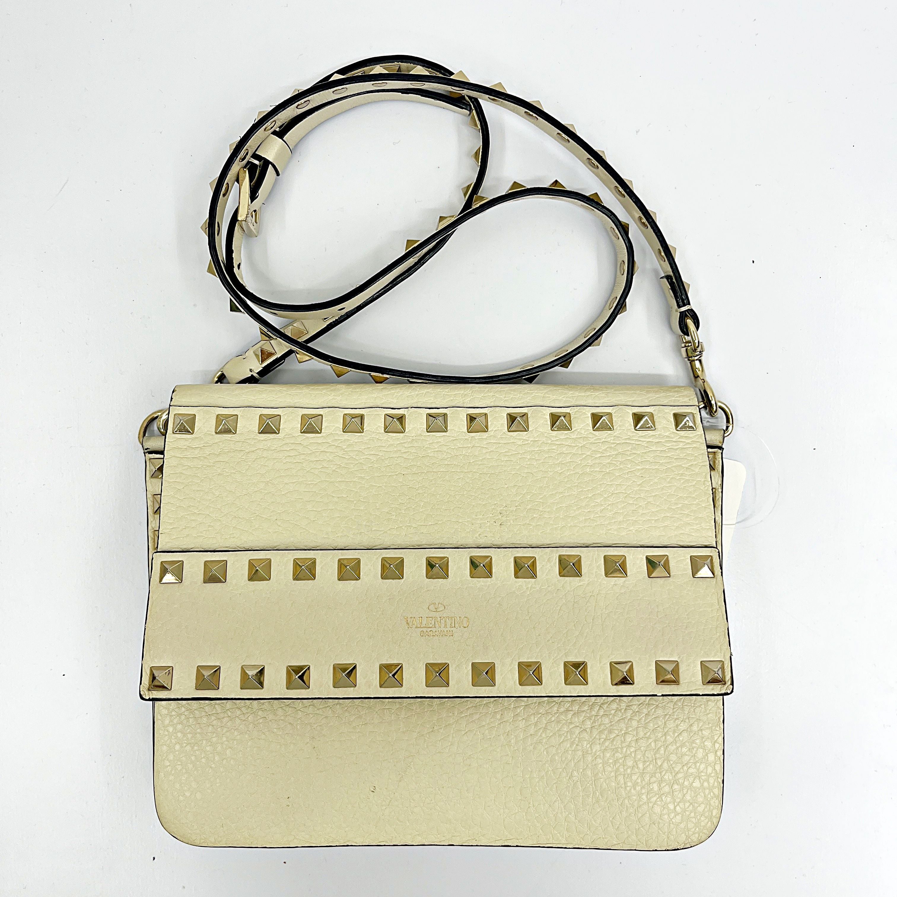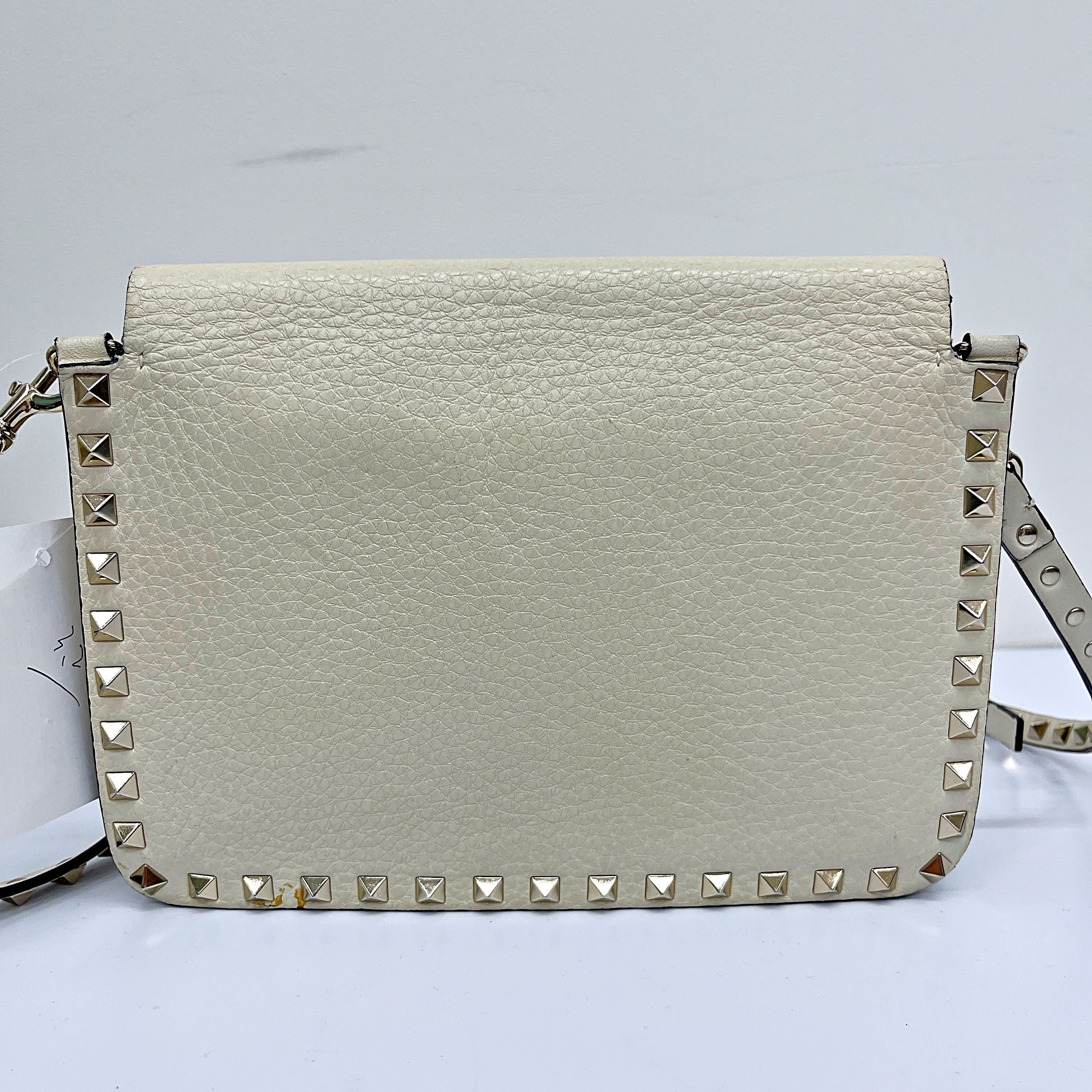 CONDITION Fair Good Very Good Great Excellent Pristine Condition Details The exterior has minor scratches and some stains, while the interior shows wear and stains. Serial Model • No Chip Authentication • Entrupy OVERVIEW Exterior Color White Exterior Material Grained Calfskin Lining Color Beige Lining Material Leather Handle/Strap Color White Handle/Strap Material Leather Hardware Color Gold Closure Flap Pattern Solid Size 6.5 x 9.5 x 3 inches Discover timeless elegance with the Valentino Garavani Grained Calfskin Small Rockstud Flap, a sophisticated round shoulder bag from the renowned Rockstud line. Crafted from luxurious white grained calfskin, this bag features a chic solid pattern and exquisite gold hardware. The beige leather interior, though showing signs of wear and stains, complements the exterior beautifully. Despite minor scratches and stains on the outside, the bag remains in very good condition, rated 8/10. Expertly authenticated by Entrupy, this used piece is a testament to Valentino Garavani's impeccable craftsmanship and style, perfect for the discerning woman.